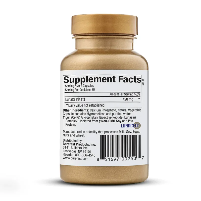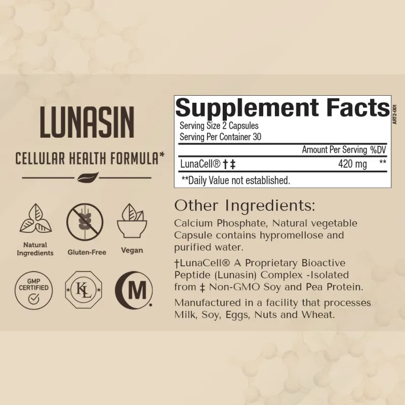 Lunasin (Bioactive Peptide Complex) -  Lunasin is a 43-chain amino acid most commonly found in soy, but is also found in other plant proteins. Lunasin has been studied for over 25 years for its vast health benefits, from cardiovascular health (such as supporting healthy LDL cholesterol levels) to supporting overall cellular health, anti-aging, and antioxidant protection within the body.  Lunasin is a powerful, naturally occurring peptide that has shown positive health benefits in research studies conducted all over the world. Lunasin works at the epigenetic level to work within the genome to keep you healthy, longer.