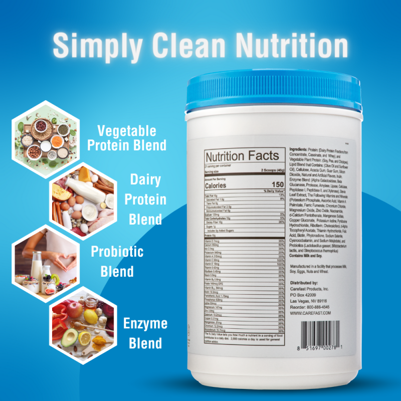 Carefast's Perfect 10 provides 10 grams of protein, 10 grams of healthy fiber, and 10 grams of healthy fats per serving, all for just 150 calories. Each serving includes a blend of eicosanoids and probiotics, along with three digestive enzymes: lipase, protease, and amylase. This keto-friendly, delicious vanilla drink mix supports your wellness goals with a balanced, nutrient-packed formula.